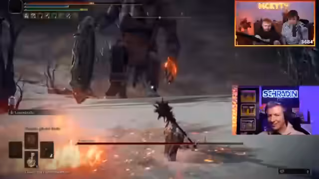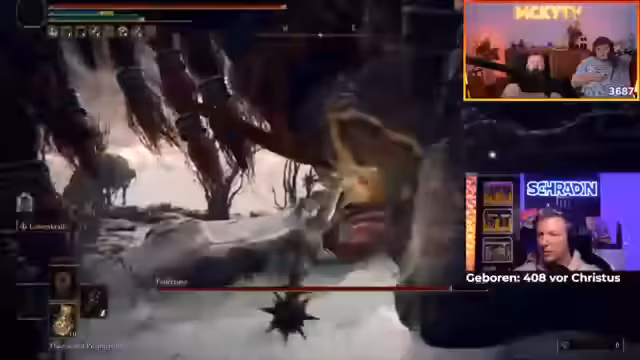 01:47:17Ein zentrales Thema ist die anhaltende Frustration des Co-Streamers Schradin beim Spielen von Elden Ring. Es wird eine Metapher eingeführt, in der Schradin als Ikarus beschrieben wird, der der Sonne (dem Boss Malenia) zu nahe geflogen ist. Die Streamer analysieren seinen Spielstil, insbesondere seine Schwächen im Ausweichen von Angriffen, und äußern Bedenken bezüglich seiner Fähigkeit, schwierige Bosse wie Malenia und Malekit zu besiegen, wenn er seine Taktik nicht anpasst.
