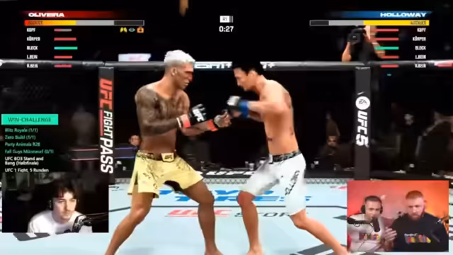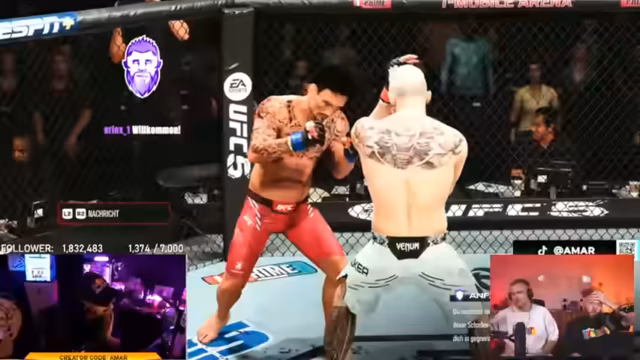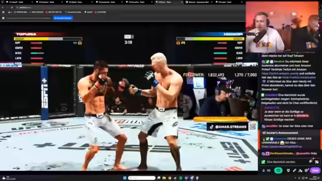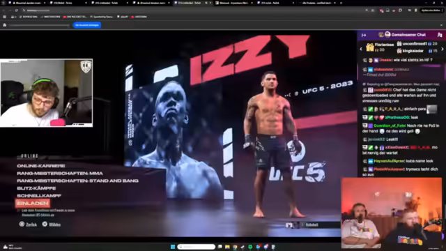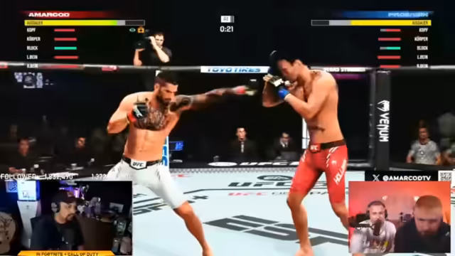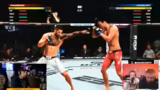 04:07:44Der UFC-Kampf zwischen Amar und Erzin beginnt. Beide Fighter wählen denselben Kämpfer, was zu einer Diskussion über ein "Mirror Matchup" führt. Der Streamer schlägt eine Regeländerung vor, um solche Duell zu vermeiden. Die ersten Runden sind von defensiver Taktik geprägt, wobei beide Kämpfer vorsichtig agieren und Ausdauer sparen. Ein Coach wird eingeführt, der nur zwischen den Runden Tipps geben darf, um den Realismus zu erhöhen. Die ersten Treffer, wie ein erfolgreicher Headkick, werden kommentiert und die Ausdauer der Fighter als entscheidender Faktor hervorgehoben.