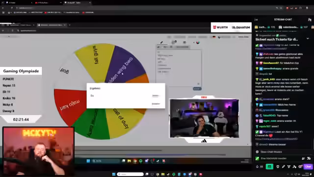 Nach einer Reihe von Wettkämpfen in Spielen wie Counter-Strike, Valorant und GeoGuessr wurde versucht, den Sieger einer Gaming-Olympiade zu ermitteln. Dabei wurden Regeln und die Wertung mehrfach diskutiert. Auch technische Umsetzungen, wie bei Elden Ring, sorgten für Verzögerungen und Frustration. Der Ausgang der Veranstaltung wird mit einem zweiten Teil fortgesetzt.