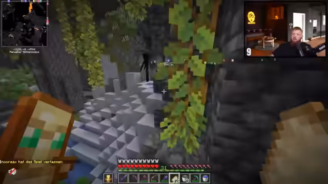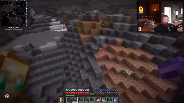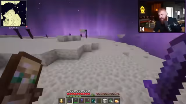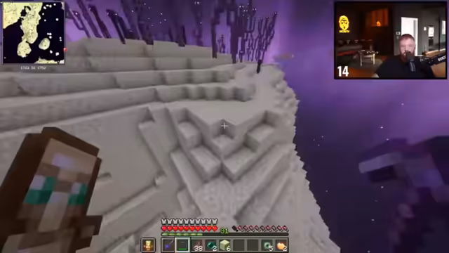 01:39:49Nach Diskussion über Baupläne und Vitamin-B-Zuführung durch Zuschauer betritt er das End, um eine Elytra zu finden. Vorab wird der Beacon mit Eisenblöcken aufgestellt. Im End angekommen, stellt er fest, dass die Inselstruktur anders ist als erwartet ('Fehlende Inseln'), und beginnt mit der Suche nach der Elytra. Es folgt eine Diskussion über Flugmechaniken und Risiken wie Abstürze.