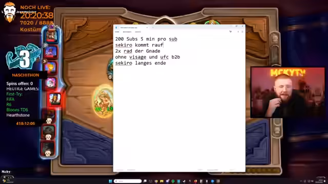 00:59:56Um 22:39 Uhr eskalieren die Diskussionen über die Game-Liste. Die Community fordert das Spiel Sekiro, was jedoch extrem zeitaufwändig ist. Nach heftigen Verhandlungen einigt man sich auf einen Kompromiss: 200 Subs von Tanzkalma zählen als 5 Minuten pro Sub, Sekiro kommt auf die Liste und der Streamer darf zweimal am Rad der Gnade drehen. UFC Back to Back und Visage werden von diesem Deal ausgenommen. Die Verhandlungen werden schriftlich festgehalten.