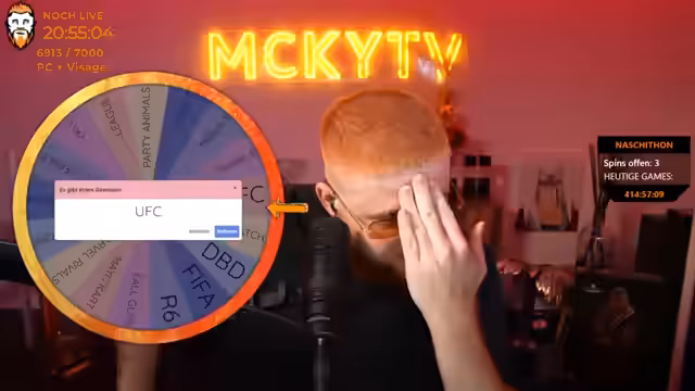 00:18:40Um 18:47 Uhr startet die erste Try-Challenge des Abends. Die Community wählt zwischen R6, FIFA und Bloons Tower Defense. Der Streamer beginnt mit R6. Parallel wird der Start eines Spins angekündigt, bei dem Visage als Belohnung für die 7000 Subs auf dem Rad der Gnade erscheint. Dies ist das erste von zehn Spins, die im Stream verlost werden, wobei ein PC als Hauptpreis ausgelobt ist.