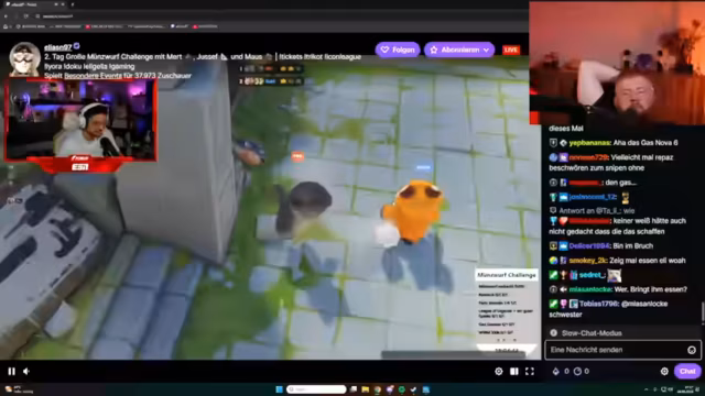 06:21:00Die Teilnehmer des Streams sind in einem Kampf gefangen, bei dem sie zusammenarbeiten müssen, um voranzukommen. Eine zentrale Rolle spielt dabei die 'Münze', die über Erfolg oder Misserfolg ihrer Versuche entscheidet. Die Community verfolgt den Kampf mit Spannung, und es wird eine hohe Verlustrate der Münze beklagt, was den Frust der Spieler erhöht. Trotz der Schwierigkeiten und der nervenaufreibenden Situation sind die Teilnehmer entschlossen, durchzuhalten und die Challenge meistern, um ihre Strafe abzuleisten.
