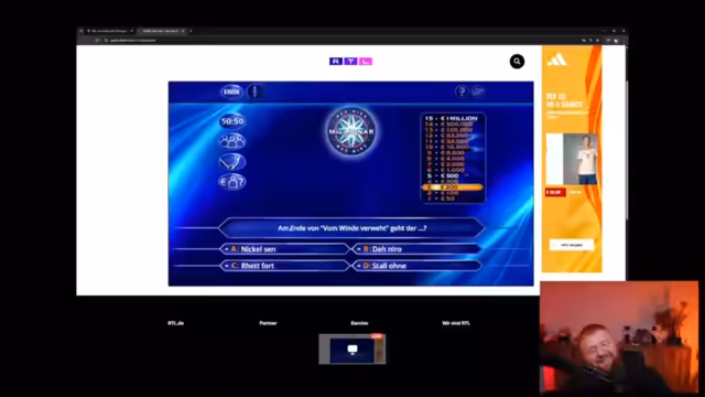 01:55:21Die Gruppe wechselt zu einem 'Wer wird Millionär?'-Quiz als Teil ihrer Challenge. Sie kämpfen sich durch mehrere knifflige Fragen, bei denen sie sich oft unsicher sind und raten müssen. Themen reichen von der Geschichte ehemaliger Hauptstädte über Namensänderungen in Büchern bis hin zu geografischen Fragen in Thüringen. Der Prozess ist geprägt von Unsicherheit, Rateerei und dem Ziel, eine bestimmte Anzahl an Fragen zu beantworten, um die Challenge zu bestehen.
