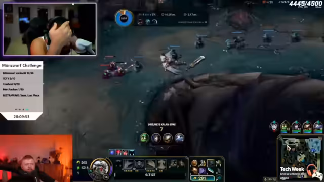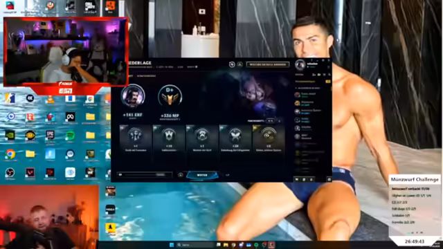 09:56:45Nachdem das Boxspiel abrupt und ohne offiziellen Endsieg abgebrochen wird, schlägt der Streamer spontan einen Wechsel zu League of Legends vor. Es wird eine Win-Challenge angedeutet, bei der es um den Sieg in mehreren Spielen geht. Die Stimmung schlägt um, da sich die Streamer auf ein anspruchsvolleres Spiel einstellen müssen. Es werden erste Unsicherheiten über die Spielstärke der Teilnehmer geäußert, besonders bei Maus, der das Spiel offenbar noch nie gespielt hat.