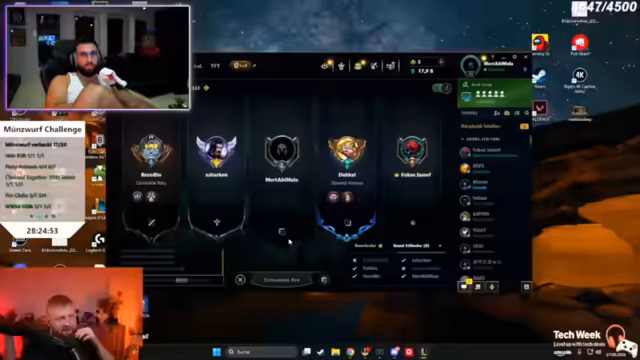10:01:10Die Vorbereitung für das League-of-Legends-Spiel entsteht in einem Zustand aus Verwirrung und Zeitdruck. Streamer wechseln mehrere Accounts, da einige keine Berechtigung haben, Ranked zu spielen oder die MMR zu hoch ist. Es kommt zu massiven Kommunikationsproblemen, bei denen Spieler aus der Lobby verschwinden oder Einladungen nicht angenommen werden. Die Teamzusammenstellung wird mehrmals umgestellt, mit der Konsequenz, dass unerfahrene Spieler wie Maus in schwierige Rollen gedrängt werden.