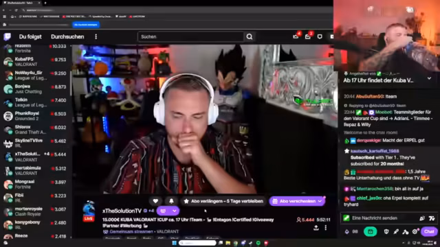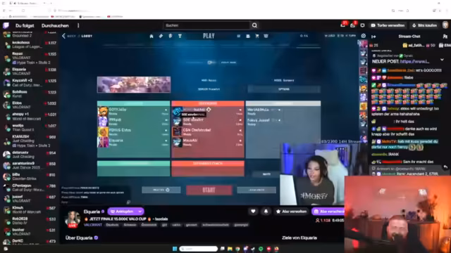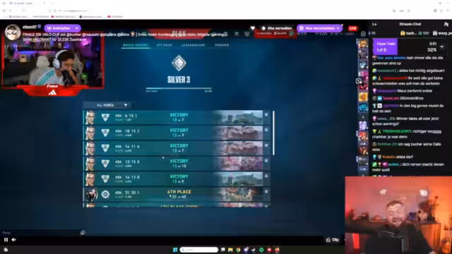 05:53:51Das VALO CUP Match zwischen den Teams von Eli und Chef wird kontinuierlich besprochen. Der Streamer und sein Team prüfen die Auswahl der Map, wobei Lothros als entspannte Option und die neue Map als gefordertes Alternativvorschlag genannt werden. Taktische Ratschläge für den Gegner Aquaria werden ausgetauscht, insbesondere der Wunsch nach einem Nerf für deren Spielerin wird im Chat angesprochen. Die Stimmung ist angespannt, aber der Fokus liegt auf einem spannenden Finale.
