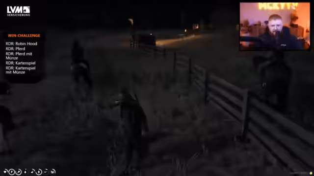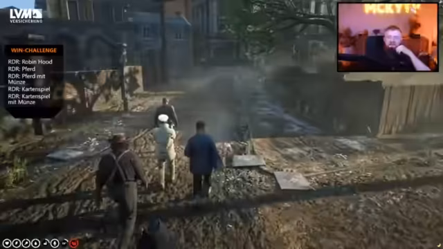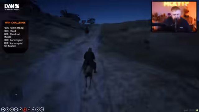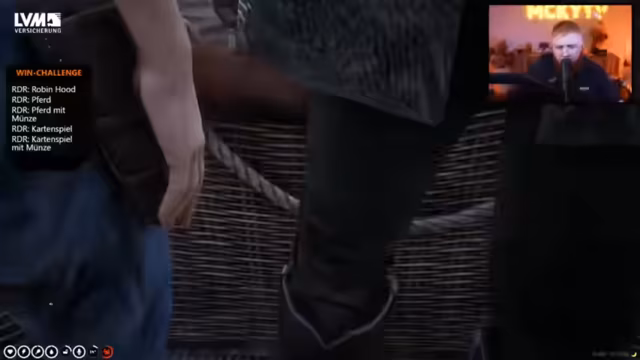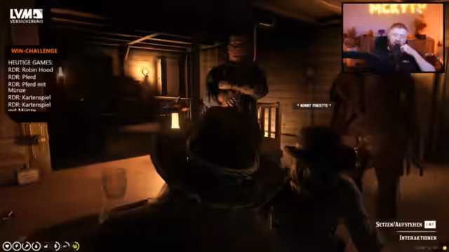 01:35:16Die im Westen angekommenen Charaktere werden konfrontiert. Es kommt zu einer Spannungssituation mit einem Sheriff, in der der Streamer von dessen Kollegen als hässlicher Fettsack beschimpft und sein treuer Esel erschossen wird. Dieser Vorfall eskaliert, bis der Streamer gefangen genommen wird. Zwischen den Aktionen im Spiel gibt es wiederkehrende Hinweise auf eine Partnerschaft mit Aldi Talk, die in Form von Werbung im Stream präsentiert wird. Der Streamer betont, dass er für die Präsentation der Werbung bezahlt wird und seine treuen Zuschauer ('treue Stücke') direkt daran teilhaben, indem er sie zum gemeinsamen Gebet für den abgebildeten Eli aufruft.