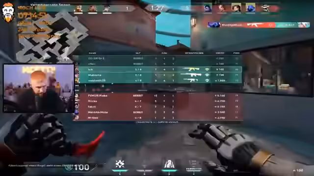07:49:40Das Team kommuniziert intensiv über die nächsten Schritte im Spiel. Ein Spieler betont die Notwendigkeit, sich nicht zu zeigen und zu warten, bis ein Teamkollege eintrifft. Die Spieler diskutieren über verschiedene Taktiken und die richtige Reaktion auf die Aktionen des gegnerischen Teams. Es geht darum, die Währung und die Waffenkaufentscheidungen zu optimieren.