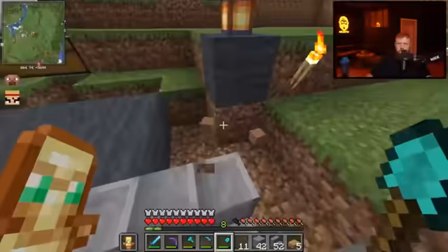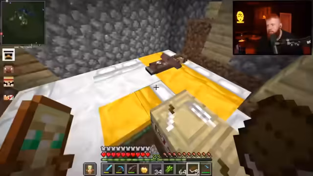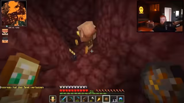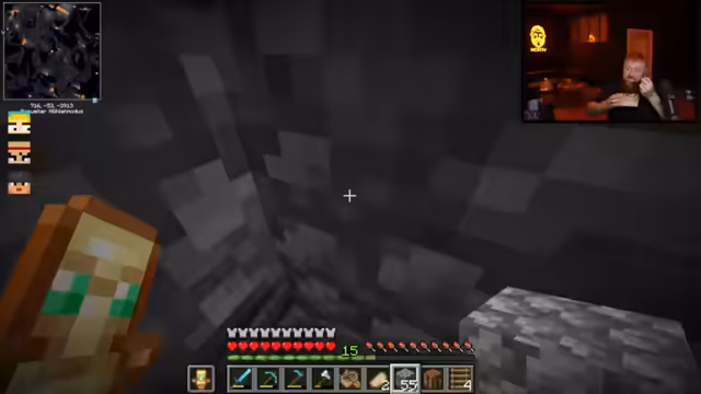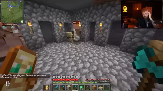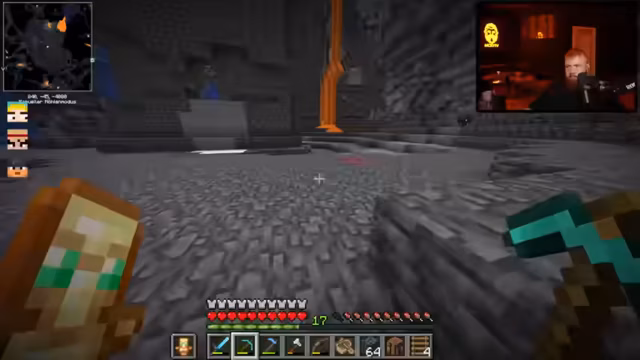 04:03:28Der Stream ist von unvorhergesehenen Ereignissen geprägt. Micky erleidet einen spektakulären Tod, als er über eine Schlucht springt und von einem Skelett mit Aimbot-Schuss downgeschossen wird. Später verliert er wertvolle Ausrüstung, als ein Creeper ihn in eine Höhle jagt und er unter Wasser ertrinkt. Diese unglücklichen Vorfälle sind reine 'Geisteskrankheit' und führen oft zum Totalverlust der Ausrüstung und zu Frust.