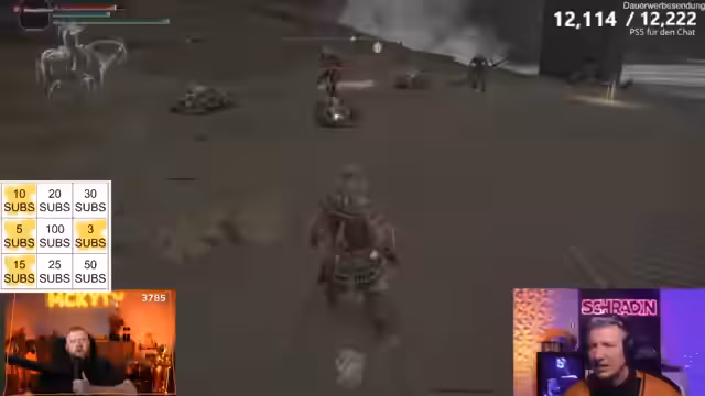 10:54:28Beobachtet wird der Fortschritt des Neulings im Spiel, der sich zu langsam und unsicher fortbewegt. Der erfahrene Spieler und der Chat äußern sich skeptisch über die Erfolgsaussichten des Neulings, der angeblich das Spiel bis Samstag durchspielen soll. Es wird eine Wette über den Ausgang des Spieles inszeniert und die Frage diskutiert, ob der Neuling die schwierigen Bosse ohne Hilfe oder 'Schummelelemente' wie Aschen oder Beschwörungen besiegen kann.