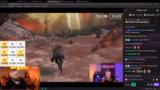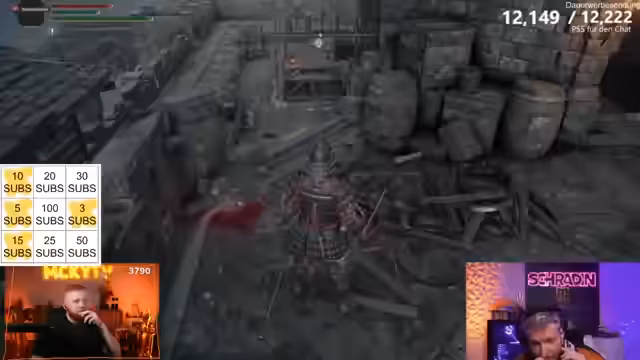 13:56:12Der Spieler befindet sich in einem Kampf gegen mehrere Gegner und opfert sich kurzzeitig, wird aber vom Streamer wieder freigespielt. Gemeinsam wird eine Taktik entwickelt, indem Fässer durch Rollen zerstört werden, um den Weg freizumachen. Nachdem der Weg frei ist, springt der Spieler durch eine Lücke, doch der Streamer vermutet, dass die Kameraführung aufgrund fehlender Controller-Erfahrung des Spielers ungenügend ist, was die Navigation erschwert.
