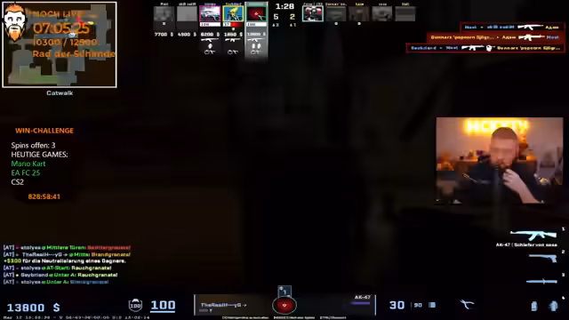 12:06:20Der Streamer spielt eine Live-Runde CS2 und gibt taktische Anweisungen an sein Team. Es wird intensiv über Strategien für verschiedene Map-Positionen wie Banana, Spot und A gesprochen. Der Streamer zeigt gutes Spielverständnis und führt sein Team zum Erfolg. Er äußert sich auch über den gegnerischen Spieler 'Father', den er besonders stark findet und der ihn mehrmals besiegt hat. Das Match endet knapp mit 26 Sekunden Restzeit.