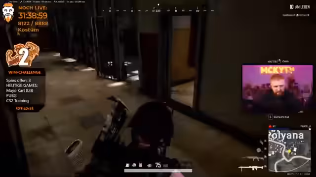 17:57:33Die Lobby erzeugt erneut Anspannung und Angst. Es wird überlegt, mit dem Auto zu entkommen ('Kanns mit Auto maximalkieren.'). Der Streamer äußert seine Frustration über das Spielgeschehen ('Lobby hat es auch wieder in sich. Wir haben schon wieder ein bisschen Angst.'). Es wird über die Ausrüstung diskutiert ('Braucht das M60 auch und dann lauft lieber mit Pistole rum, ohne Spaß.'). Der Streamer versucht, einen Gegner zu überraschen ('Ich pisselte den einfach. Ich lande auf seinem Top.'). Er probiert eine neue Geschmacksrichtung ('Ich probiere jetzt zum ersten Mal Mangofassionsfrucht') und bittet um Feedback aus dem Chat. Ein Zuschauer gibt eine positive Bewertung. Der Streamer plant, einen Loadout zu holen und fragt nach Geld von den Zuschauern. Es wird über die Position von Gegnern diskutiert ('Das sind die von Airport.'). Der Streamer wird beschossen und sucht nach dem Schützen ('Irgendjemand snipet auf uns.'). Er analysiert die Position des Gegners ('Er ist unten. Aber da.'). Es kommt zu einem Feuergefecht in einem Gebäude ('Auf Fenster, auf Fenster.'). Der Streamer und seine Mitspieler werden von mehreren Seiten angegriffen ('Wir werden so gezoneholdet jetzt.').