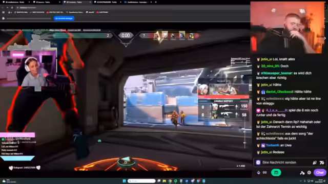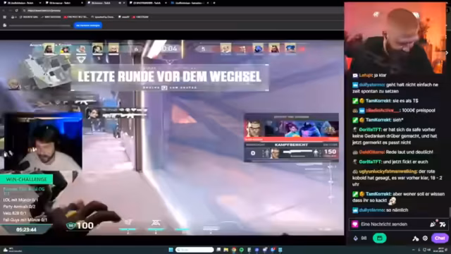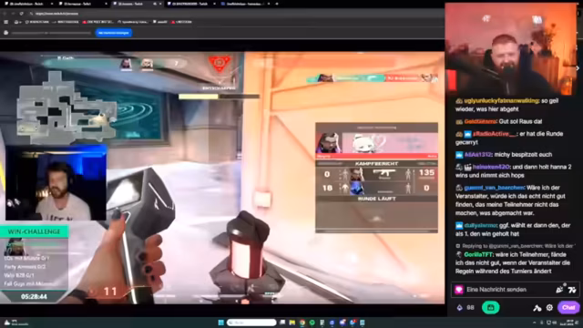 03:39:41Der Streamer ist mitten im Geschehen und kommentiert sein Gameplay im Detail. Er äußert sich über seine Mitspieler, analysiert seine Entscheidungen und äußert Frustration über verpasste Gelegenheiten, insbesondere was Headshots und Kills betrifft. Es kommt zu spontanen Reaktionen auf die Aktionen anderer Streamer und Spieler im Chat, was eine dynamische und nervöse Atmosphäre während der Wettkämpfe erzeugt.