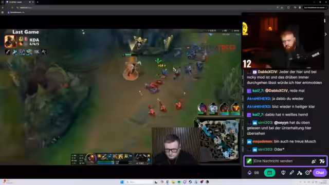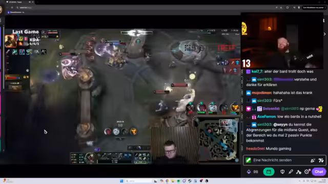 02:08:48Der Streamer analysiert ein verlorenes League of Legends Match, in dem er trotz früher Vorteile und guter individueller Leistung mit einem schwachen Team verlor. Er kritisiert Entscheidungen seiner Mitspieler, beschreibt detaillierte Spielzüge wie ganking und lane control, und thematisiert die Herausforderung, verlustreiche Lanes zu ignorieren. Dabei äußert er sich grundsätzlich skeptisch zur aktuellen Valo-Szene und Riot Games' Aktuellen.