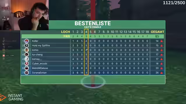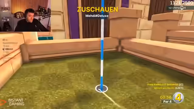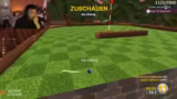 03:58:29Während des Golf Cups kämpfen die Spieler mit anspruchsvollen Löchern und unvorhersehbaren Ballverhalten. Kritik wird an manchen Maps geäußert, die als geistkrank und unfair beschrieben werden. Die Stimmung ist angespannt, und die Spieler feuern sich gegenseitig an, während sie versuchen, schwierige Schläge zu meistern und teilweise knapp am Loch vorbeizuschießen. Der Fokus liegt auf Teamkommunikation und der Unterstützung der Mitspieler bei ihren Zügen.