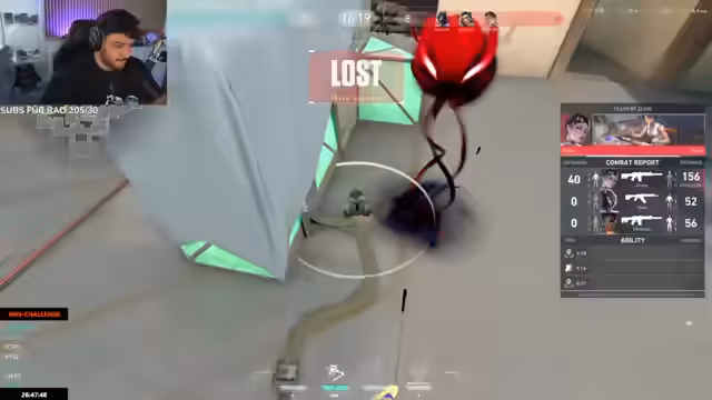 03:49:30Bei einem Stand von 1-7 für das Team äußert Mehdi seinen Ärger über das mangelnde Engagement der Mitspieler. Obwohl er über 10 Kills erzielt, verlieren sie das Match. Trotz der Verluste kündigt er an, weiterzuspielen, und gibt bekannt, einen Sale für Subs zu starten, um das Rad drehen zu lassen. Die Motivation ist weiterhin auf ein mögliches Winning-Streak-Play gerichtet.