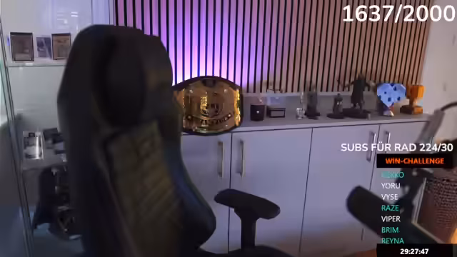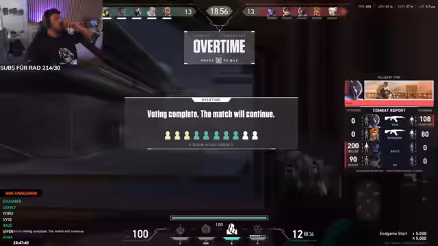 00:12:28Der Streamer informiert über den aktuellen Stand der BAIT-CHALLENGE. Zusammen mit seinem Partner Pannewitz wurden bereits fünf von acht Agenten abgehakt, darunter Raze, Brimstone und Chamber. Das Spielprinzip basiert auf einem Rad, das bei jeder 30er-Marke an Subs gedreht wird. Dieses Rad entscheidet über die Runden-Reset oder die Freischaltung neuer Agenten. Die Herausforderung besteht darin, die verbleibenden drei Champions zu schaffen, ohne das verhängnisvolle Rad 3 mit einem Challenge-Reset zu erwischen.