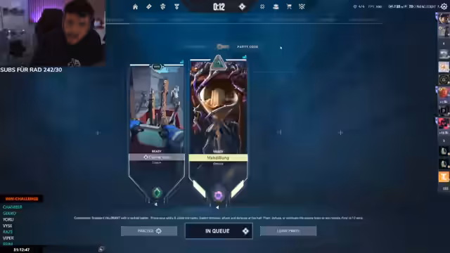 Es wurde an einer komplexen Challenge bei VALORANT gearbeitet. Gemeinsam mit einem Partner wurde versucht, eine Reihe von Agenten freizuschalten. Das Spielprinzip basierte auf einem Glücksrad, das bei bestimmten Meilensteinen gedreht wurde. Es bestand jedoch das Risiko eines Resets, der bis dahin erreichte Fortschritte zunichtemachen konnte.