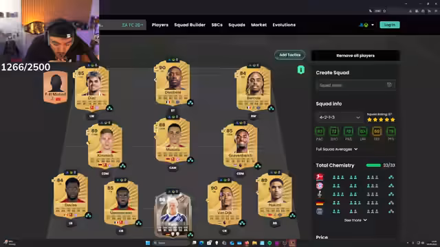 01:05:02Der Streamer analysiert einzelne FIFA-Spielerkarten im Detail, die ihm für sein Team vorschweben. Er verglekt Statistiken von Spielern wie Goretzka und Onana und diskutiert deren Eignung für sein System. Dabei zeigt er sich besonders an spielstarken Spielern mit hohen Werten in Dribbling und Passen interessiert. Auch das Potenzial seltener Spielerkarten, wie die von Lamine Yamal, wird thematisiert, die aufgrund ihres Namens wahrscheinlich sehr teuer sein werden.