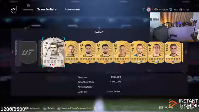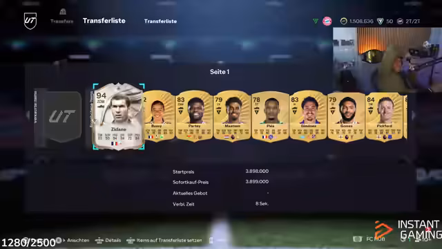 00:28:20Der Streamer führt eine Marktanalyse durch und stellt fest, dass viele Spieler wie Konaté, Dembélé und Zidane im Wert steigen. Besonders bei Zidane sieht er Potenzial und versucht, diesen für einen guten Preis unter 3,2 Millionen Münzen zu erwerben. Es kommt zu einem Bieterkrieg, bei dem er letztlich für 3,3 Millionen zuschlägt. Er analysiert auch andere Karten wie den jungen Ibrahimovic, den er für unter 4,5 Millionen als gute Investition ansieht, und Frankie de Jong, den er ebenfalls testet.