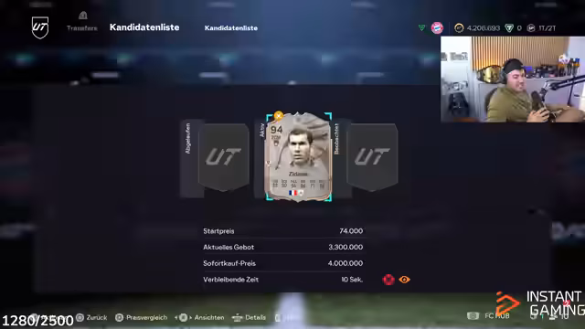 02:12:33Der Streamer befasst sich intensiv mit dem Transfermarkt, insbesondere mit dem Kauf und Verkauf von Spielerkarten. Sein Hauptziel ist der Spieler Zidane, den er für 3,2 Millionen erworben hat und mit einem Gewinn von bis zu 700.000 für 3,9 bis 4 Millionen weiterverkaufen möchte. Er analysiert den Markt, vergleicht Preise und erwägt verschiedene Strategien, um den höchsten Gewinn zu erzielen, und diskutiert die Risiken, wenn andere Spieler den Preis drücken.