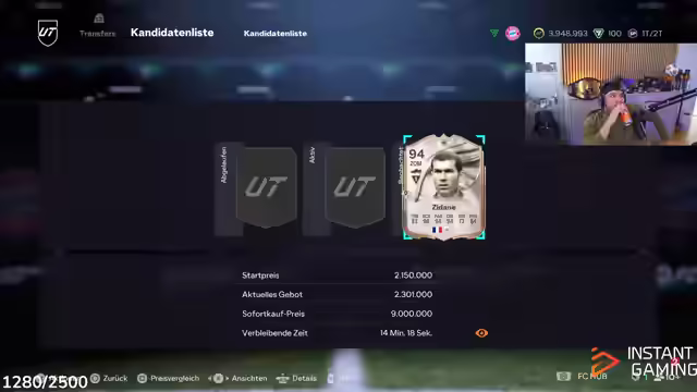 02:00:21Es wird überlegt, ob ein Preis unter 1,5 Millionen für Eric Cantona ein guter Deal wäre, da der Streamer nicht lange online sein wird. Es wird spekuliert, dass jemand Coins benötigt und Cantona möglicherweise günstiger verkauft. Es wird festgestellt, dass es aktuell keinen Cantona auf dem Markt gibt. Es wird überlegt, ob alles unter 1,3 oder 1,4 Millionen ein guter Preis für Cantona wäre. Die Formation wird als fehlerhaft angezeigt. Es wird überlegt, Dembélé zu kaufen und Daniela einzusetzen. Es wird überlegt, auf eine 4-Triple-2 Formation umzusteigen, um mit Flügeln spielen zu können. Es wird nach dem Sisu gesucht. Es wird festgestellt, dass der günstigste Sisu aktuell 4,2 Millionen kostet, nachdem er zuvor für 3,3 Millionen eingekauft wurde. Es wird überlegt, ob der Verkäufer einen Gewinn von 500.000 machen könnte, wenn er den Sisu für 4 Millionen verkauft. Es wird sich darüber geärgert, dass jemand einen Zlatan für 5 Millionen gekauft hat. Es wird überlegt, Dembélé für 2,5 Millionen zu kaufen und die restlichen 1,4 Millionen Coins zu behalten. Es wird überlegt, sie wieder zu verkaufen, da sie aktuell im Wert gestiegen ist. Es wird überlegt, Zico zu kaufen. Es wird überlegt, Zidane als ZOM in einer 4-Triple-2 Formation einzusetzen. Es wird festgestellt, dass es wieder PSN-Karten bei Instant gibt.