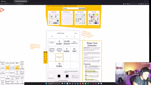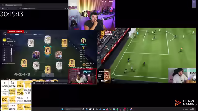 00:29:34Es wird intensiv über die Gestaltung von Bingos für die anstehenden Watchpartys und Weekend League Sessions diskutiert. Dabei sollen sowohl Ereignisse im Bayern-Frankfurt-Spiel als auch typische Verhaltensweisen von Streamer-Kollegen wie Danny und Pannewitz berücksichtigt werden. Der Streamer plant, verschiedene Elemente wie Zitate von Lothar Matthäus, Controller-Würfe, Chat-Beleidigungen und englische Ausdrücke von Casey einzubauen. Es wird auch über mögliche Aktionen der Zuschauer diskutiert, wie das Sabotieren des Spiels durch Drehen an einem Glücksrad gegen Nashis. Parallel dazu verfolgt der Streamer die Bundesliga-Konferenz und kommentiert die aktuellen Spielstände, insbesondere von Borussia Dortmund und Werder Bremen. Im Hinblick auf die Weekend League werden verschiedene Team-Anpassungen erwogen, insbesondere der Austausch von Garincha aufgrund seiner unbefriedigenden Leistung. Es werden Alternativen wie Lemine Jamal diskutiert, aber auch die potenziellen Auswirkungen auf das Team-Playstyle berücksichtigt. Der Streamer experimentiert mit verschiedenen Einstellungen und Taktiken, um die Passgenauigkeit zu verbessern und das Zusammenspiel im Team zu optimieren.