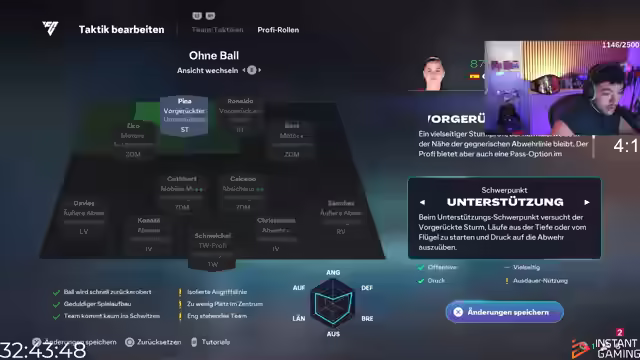 07:46:05Es wird die übertriebene Stärke von Cristiano Ronaldo im Spiel hervorgehoben und der Ärger über eine verlorene Partie (8-5 nach einer 3-0 Führung) geäußert. Der Wunsch, die 4-Triple-Two Formation zu spielen, wird erneut betont, obwohl Bedenken hinsichtlich der Verteidigung bestehen. Es wird überlegt, welche Spieler in dieser Formation eingesetzt werden könnten, insbesondere Eto'o als zweiter Stürmer. Es wird der Verlust von Ribéry im Team bedauert, da dieser nur LMR oder LRF spielen kann. Es wird überlegt, ob man die Formation in Rivals testen soll, was jedoch den Kauf und Verkauf von Spielern erfordern würde. Zico wird als möglicher Spieler für die Formation in Betracht gezogen, wobei seine Trades (angeschnittener Schuss, Tiki-Taka, Dreieck R1) als positiv bewertet werden. Es wird überlegt, ob Niki Crashout Weekend League spielt und was er macht. Es wird festgestellt, dass Zidanes Dreieckspässe nicht ideal sind. Es wird nach einem Z2M gesucht, der geile Pass-Playstyles hat, aber in 4-Triple-Two im Z2M spielen kann. Maradona wird als Option genannt.