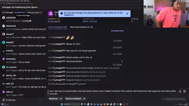 00:31:46Ein zentraler Teil des Streams ist die öffentliche Bearbeitung von Entbannungsanträgen aus dem Chat. Der Streamer prüft jede einzelne Anfrage kritisch und entscheidet, ob er den Nutzer wieder entbannt. Die Gründe für die Bans sind vielfältig und reichen von falschem Username über 'Fitner'-Kommentare bis zu Spoilern im Spiel. Er entscheidet dabei oft humorvoll oder sarkastisch, manchmal aber auch streng, und begründet seine Entscheidungen für die Zuschauer.