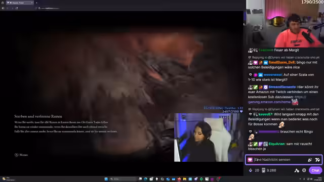 00:59:31Der Streamer spielt Elden Ring und kämpft gegen den Boss Margit. Er kommentiert sein Gameplay live und gibt dabei Einblicke in seine Strategie. Er betont die Wichtigkeit von bestimmten Moves, dem Blocken von Angriffen und dem Aufbauen von Blutungsschaden. Bei seinen Versuchen wird er manchmal frustriert, wenn er meint, den Kampf nicht gewinnen zu können, und sucht nach dem richtigen Timing für seine Angriffe.