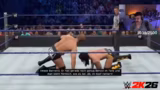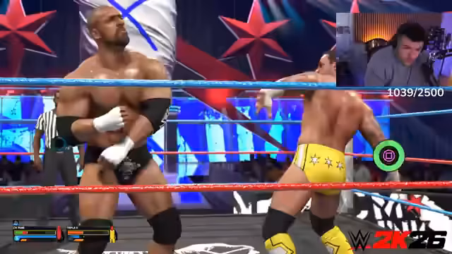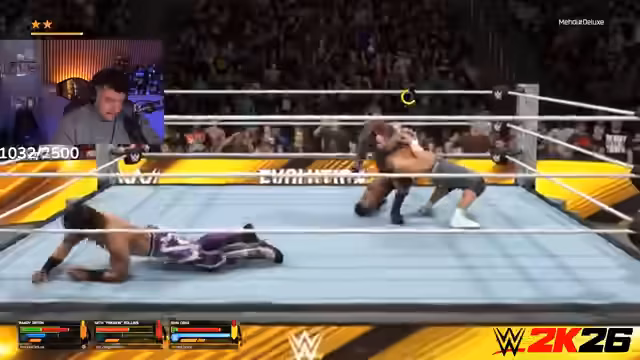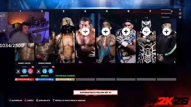 02:24:41Der Streamer startet ein Royal-Rumble-Match im WWE 2K26-Spiel. Nach anfänglichen technischen Herausforderungen mit der Lobby-Erstellung und Verbindung der Teilnehmer gelingt es, eine private Runde mit mehreren Zuschauern aufzubauen. Der Streamer wählt Seth Rollins, während andere Streamer wie Ziegenmann als Seth Rollins und Jinx Jason als John Cena antreten. Das Match beginnt und ist schnell von zahlreichen Kontern und Aktionen geprägt, wobei Streamer wie Ziegenmann und Rob Van Dam (ebenfalls ein Streamer) frühzeitig eliminiert werden. Der Streamer selbst, später als Randy Orton, kämpft sich durch das Feld.