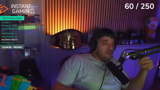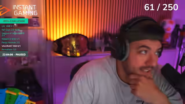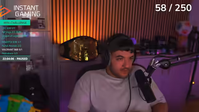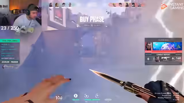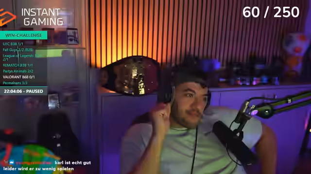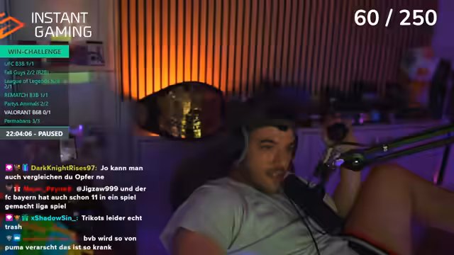 03:03:48Die Baitrad Win Challenge pausiert, da der Streamer vergessen hatte, den Timer zu stoppen. Er bewirbt einen Link von Instant Gaming, über den man Valorant Points zum vergünstigten Preis erwerben kann, da die regulären Preise teuer sind. Der Stream wechselt zwischen Valorant, seinen Gedanken zur Bundesliga (wie seine "Anti-Sympathie gegen Köln") und einer Diskussion über eine Schlafmaske, die er als Game-Changer für seinen Schlaf empfiehlt.