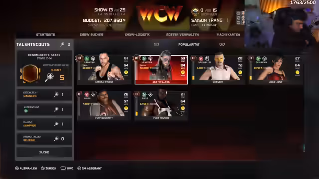 05:05:56Der Streamer beschäftigt sich mit der Kaderplanung und überlegt, ob er die Verträge von Bret Hart und Rick Steiner verlängern soll. Da er knapp bei Kasse ist, muss er abwägen, welche Wrestler er behalten möchte. Er entscheidet sich, Rick Steiner nicht zu behalten, da dessen Popularität nicht ausreichend ist. Es wird ein Steel Cage Match gebucht, um die Show aufzuwerten. Der Streamer plant, für die nächste Woche alle Wrestler fit zu halten, um eine starke Show zu präsentieren. Er überlegt, ob er die Kaktus-Jack-Karte einsetzen soll, um die Konkurrenz zu schwächen, entscheidet sich aber dagegen, da er sie für Go Home aufsparen möchte. Es wird eine Kackshow gebookt, da die nächste Show wichtiger ist. Es wird überlegt, ob Panda anwesend ist und die Entscheidungen des Streamers mitbekommt.