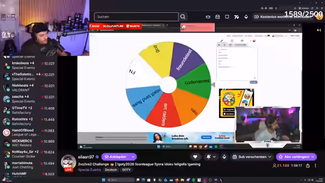 03:18:13Der Streamer kündigt ein gemeinsames 2-gegen-2-gegen-2-Turnier mit anderen Streamern an. Panne ist sein festes Teammitglied, während die anderen Teams wahrscheinlich aus Eli, Willi, Yusef und Maus bestehen. Die Spiele Ark Raiders, Velo, Fortnite und Codenames sind bereits festgelegt. Dieses Event stellt eine geplante Kooperation zur Unterhaltung der Zuschauer dar.