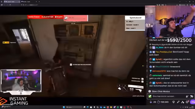 10:00:07Die Konzentration liegt auf den strategischen Bewegungen innerhalb des Spiels. Der Streamer überlegt, ob er ins Rathaus gehen soll, da er einen Schlüssel dafür besitzt, sich aber unsicher über die Risiken ist. Gleichzeitig wird der Stand der Gegner, Maus und Luisa, beobachtet. Es finden Diskussionen über die Waffenmunition statt, und der Streamer plant, sich einen sicheren Ort zum Campen zu suchen.