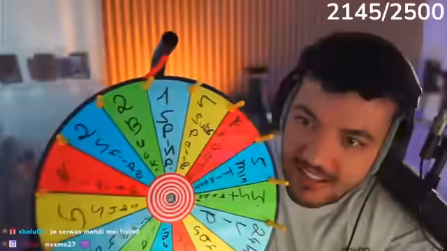 10:03:08Der Streamer nutzt ein interaktives Glücksrad für Aktionen und Spenden, das im Mittelpunkt des Streams steht. Zuschauer können sich durch Spinden, Sub-Gifts oder Spenden die Möglichkeit sichern, am Rad zu drehen. Jedes Drehen führt zu einer Aktion, wie einem Spin im Spiel oder einem verbalen Duell. Es werden konstant Befehle für das Rad gegeben und die Reaktionen darauf gezeigt.