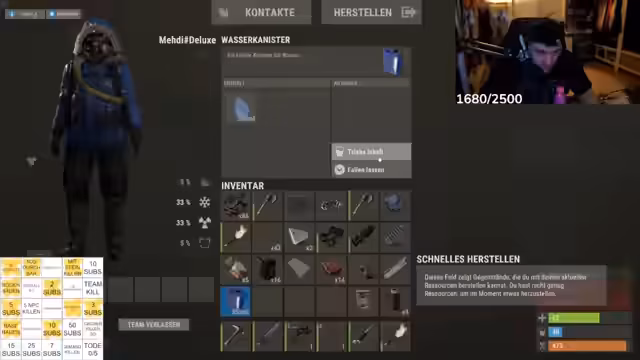 07:24:16Es wird überlegt, welche Blaupausen freigeschaltet werden sollen, wobei der Fokus auf dem liegt, was gerade benötigt wird, um Schrott zu sparen. Kilian stellt Federn für AKs bereit. Es wird geklärt, dass man vor einer Werkbank stehen muss, um Gegenstände herzustellen. Die Gruppe lernt ständig dazu und freut sich auf zukünftige Kämpfe. Es wird empfohlen, Spitzhacken als Reserve in den Kisten zu lagern. Ein Mitglied füllt einen Kanister mit Wasser, stellt aber fest, dass es Salzwasser ist. Richard Rimjob wird für sieben geschenkte Subs gedankt. Es wird überlegt, wie man Salz- und Süßwasser unterscheidet. Ein Mitglied benötigt Metallverbände und Süßwasser, die ihm von einem anderen gegeben werden. Die Gruppe diskutiert, dass die Base mit TNT hochgejagt werden kann, weshalb ein Ausbau mit Metall wichtig ist. Ein Bauplan für eine Axt wird gefunden. Es wird nach Treibstoff für ein Motorrad gesucht. Ein SMG-Gehäuse soll behalten werden, da es wichtig erscheint. Die Gruppe tauscht Schrott aus, um sich gegenseitig zu unterstützen. Kilian erhält eine Feder und schaltet Baupläne frei. Es wird hochwertiges Metall abgebaut und ein Wasserkanister befüllt.