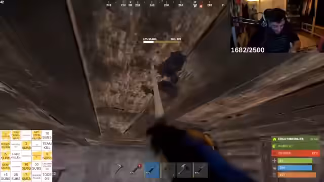05:28:53Es wird überlegt, was mit dem Schrott anzufangen ist, und der Mangel an einer Spitzhacke wird bemängelt. Schüsse werden in der Nähe gehört, möglicherweise in der Nähe von Danny. Danny ist mittellos und stirbt oft, verliert dabei seinen Loot. Er kündigt an, wo er gestorben ist, damit sein Loot gefunden werden kann. Die Gruppe betont die Wichtigkeit, Metall-Sachen mitzunehmen, um Schrott zu machen. Danny hat die Base verschönert, um mehr Platz zu schaffen. Ein anderer Spieler wird gefickt. Es wird überlegt, Schrott zu farmen. Die Gruppe will Rüstung ready machen. Es wird ein Hubschrauber gesichtet, der Angst verursacht. Die Gruppe versucht, sich vor dem Hubschrauber zu verstecken, indem sie ihre Rüstung ausziehen und die Waffen wegpacken. Es wird Metall gefarmt, und es wird überlegt, was als Nächstes gebaut werden soll. Die Tankstelle wird als guter Ort zum Schrotten von Dingen angesehen. Es wird überlegt, was als Nächstes freigeschaltet werden soll, wobei Rüstung und Werkbankstufe 3 zur Debatte stehen. Kilian soll die Waffen machen. Es wird Metall gefarmt, um eine Waffe zu bekommen. Die Gruppe macht Fortschritte, aber Danny stirbt oft. Es wird überlegt, mehr Öfen zu bauen. Es wird diskutiert, wie man Pfeile herstellt. Yushi soll nicht getroffen werden. Es werden halbautomatische Gehäuse gefunden. Die Gruppe recycelt Gegenstände, um Ressourcen zu gewinnen.