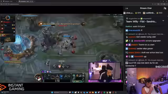 02:21:30Das Team finalisiert seine Strategie, während im Stream des Veranstalters die Pick- und Ban-Phase der anderen Teams läuft. Für den 'Braum'-Spieler wird der Item-Build mit 'Redemption' und 'Solari' als Standard festgelegt, wobei die Anwendung von 'Solari' als Schild gegen gegnerische Ultimates wie 'Lux' oder 'Jax' erklärt wird. Die Bedeutung von 'Redemption' als Heilungs-Item, das auch nach dem Tod eingesetzt werden kann, wird hervorgehoben. Die Spieler sind sich der Stärke der gegnerischen Champions wie 'Mundo', 'Jax' und 'Smolder' bewusst und planen ihre Item-Builds und Spielweise entsprechend, um diesen entgegenzuwirken. Es wird erwähnt, dass das Spiel von 'Sarah' im Stream gecastet wird und dass die Gegner 'Evelynn' nicht gebannt haben, aber Angst vor 'Willi' hatten und 'Zed' und 'Volibear' gebannt haben. 'Willi' spielt 'Mordekaiser', was als sein Main-Champion und eine starke Wahl angesehen wird, da er einen Gegner für zehn Sekunden aus dem Kampf nehmen kann. Die Teammitglieder besprechen die Rollenverteilung und die Strategie für den Kampf, wobei 'Willi' den 'Pro' ulten und dann 'Zhonya's Hourglass' benutzen soll, um den Gegner zu neutralisieren. Die Identität der gegnerischen Spieler, wie 'Jockel' als 'Tuni' und 'Toto' als 'Tolkien', wird geklärt, um die Strategie anzupassen. Die Diskussion über die Position von 'Sane' auf der Toplane und die Entscheidung, 'Kog'Maw' auf der Mitte zuzulassen, zeigt die Flexibilität der Strategie.