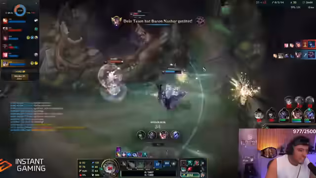 02:50:13Nachdem wichtige gegnerische Ultimates verbraucht wurden, beschließt das Team, aggressiv vorzugehen und den Nashor (Baron) zu starten. Die Strategie sieht vor, nach dem Base-Besuch direkt zur Nash-Area zu gehen, Vision zu sichern und den Baron zu beginnen. Es wird betont, dass das Team aufgrund der fehlenden Ultimates der Gegner einen erheblichen Vorteil hat. Die Spieler koordinieren sich, um den Baron schnell zu besiegen und gleichzeitig die Top-Lane zu pushen. Die Kommunikation über die Positionen der Gegner, insbesondere Jax, ist entscheidend, um unerwartete Engagements zu vermeiden und den Baron erfolgreich zu sichern. Der erfolgreiche Baron-Buff ermöglicht es dem Team, die Türme der Gegner weiter unter Druck zu setzen und einen entscheidenden Vorteil im Spiel zu erlangen.