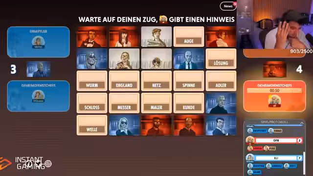 12:27:23Das Codenames-Spiel startet mit einigen technischen Problemen, da das Design der Plattform anders aussieht und die Spieler Schwierigkeiten haben, sich in die Teams einzufinden. Es wird festgestellt, dass ein Update stattgefunden hat, was zu Verwirrung führt. Nach einigen Anlaufschwierigkeiten und der Hilfe der Mods gelingt es, die Teams aufzuteilen. Die Spieler diskutieren über die Einsatzhöhe der Wetten für die Codenames-Runde, wobei Vorschläge zwischen 0,5, 10 und 20 'Subs' gemacht werden. Die Regeln für das Erklären der Wörter werden festgelegt, und die erste Runde beginnt mit dem Versuch, Wörter wie „Verein Hand England“ zu erraten, was sich als knifflig erweist und zu weiteren Diskussionen führt.