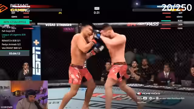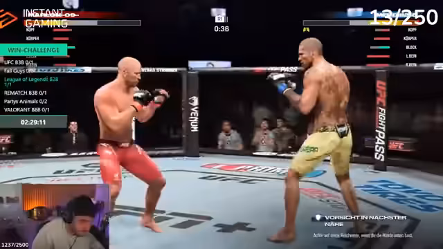 03:35:38Der Streamer kommentiert seine UFC-Kämpfe, analysiert seine Fehler und versucht, seine Strategie anzupassen. Er kündigt an, dass er einen Kampf mit einem Knie beenden wird. Nach einem Sieg wird direkt ein Back-to-Back-Versuch gestartet. Der Streamer äußert seinen Unmut über das Spiel Velo und betont, dass er nach dem Spiel jemanden braucht, der am Rad dreht. Es wird überlegt, ob es Angebote im Chat für das Rad gibt. Der Streamer beschreibt seine Taktik und die Schwierigkeiten im Kampf, insbesondere die Ausdauer und die Angriffe des Gegners. Er reflektiert über seine Leistung und die Notwendigkeit, ruhiger zu spielen und gezielte Uppercuts zu setzen. Nach einem weiteren Kampf, der verloren geht, werden alternative Spiele wie Geo-Gesser und Higher-Lower in Erwägung gezogen. Der Streamer betont, dass er keine Lust auf Velo hat und dass ihm das Spiel aktuell keinen Spaß macht. Er fordert die Zuschauer auf, Subs für das Rad zu spenden.