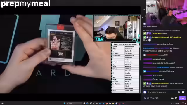 01:31:08Der Streamer kündigt den Übergang zum Hauptereignis des Tages an, dem WWE-Box-Break, der gegen 14 Uhr stattfinden soll. Er erklärt den Ablauf: Er hat einen 'Spot' (einen Buchstaben) gekauft und alle Karten, die mit diesem Buchstaben beginnen, gehören ihm. Diese werden in zehn Boxen geöffnet und ausgelost. Das Ziel ist, nicht auf den Wert, sondern auf coole Karten für seine Sammlung zu hoffen, zum Beispiel 'Roman Reigns' oder 'Randy Orton'.