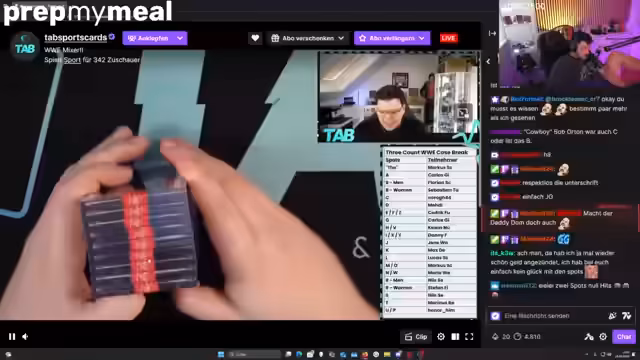 01:31:08Es wird angekündigt, dass in Kürze ein WWE-Karten-Box-Break mit den Jungs von Steini und René von Tapskart stattfinden wird. Es werden zehn Boxen des "Three-Count"-Sets geöffnet, wobei jede Box drei Packs enthält. Der Ablauf wird erklärt: Zuschauer können Spots kaufen, die mit Buchstaben versehen sind. Ein Randomizer in Excel lost dann eine Reihenfolge von Buchstaben aus. Wenn ein Zuschauer beispielsweise den Buchstaben R hat, erhält er alle Karten, die mit R beginnen, wie Ray Mysterio, Randy Orton oder Roman Reigns. Ziel ist es, seltene Karten wie die Downtown-Karten zu ziehen, die ein Comic-Design haben. Es wird betont, dass es nicht primär um den Wert der Karten geht, sondern darum, coole Karten zu erhalten, die man ausstellen kann. Der Streamer hofft auf gute Spots wie R, M oder N, wobei R für Männer steht. D wäre auch gut, da es Top-Tier-Leute wie The Rock oder Cody Rhodes beinhaltet, auch wenn es weniger Optionen gibt.