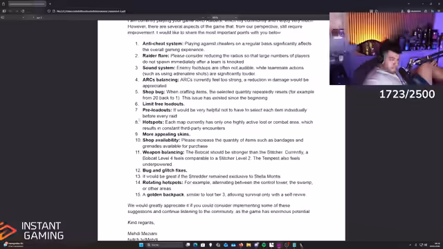 01:22:23Der Streamer kündigt an, dass er einen Brief an die Entwickler von Arc Raiders schicken wird, der Verbesserungsvorschläge der Community enthält. Er liest eine umfassende Liste mit Punkten vor, die das Spielbalancing, den Shop, neue Map-Features, Anti-Cheat-Maßnahmen und Sounds betreffen. Er hofft, dass das Entwicklerteam auf diese konstruktive Kritik eingeht.
