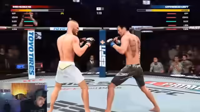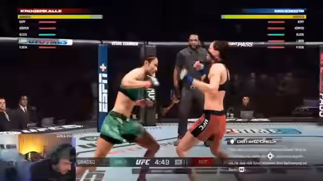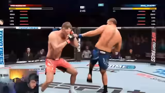 03:09:36Der Streamer widmet sich intensiv dem Training für den UFC-Modus in einem Spiel. Er analysiert seine Fehler in vorherigen Kämpfen und erkennt, dass zu viele leere Schläge seine Ausdauer senken. Stattdessen sollen gezielte Jabs und Gerade folgen. Er stellt die Wirkung von Kicks und Haken zum Körper und die Power von Uppercuts heraus. Das Training ist ein Vorbereitung für einen potenziellen Cup von Danny und dient als mentale Abwechslung.