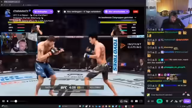 06:10:06Der Streamer diskutiert bevorstehende UFC-Kämpfe im Detail. Er erwähnt das Duell zwischen Dustin Poirier und Max Holloway sowie den Kampf von Islam Dunatov. Er drückt seine Begeisterung für den Sport aus und zeigt großes Interesse an den Kämpfen. Die Atmosphäre ist aufgeregt, er kommt nicht weg vom Thema und äußert sich sehr leidenschaftlich über die bevorstehenden Weekend-Kämpfe, was die hohe Priorität zeigt, die er diesem Sport einräumt.