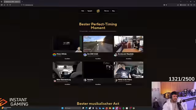 01:26:33In der Kategorie 'Bester Perfect Timing Moment' sticht ein Clip hervor, in dem jemand zufällig in einen Graben fällt und dabei einen 20-Euro-Schein findet. Dieser unerwartete Fund wird als 'Glückstag' und 'krass' bezeichnet, da die Wahrscheinlichkeit eines solchen Ereignisses sehr gering ist. Die Zufälligkeit des Abrutschens und des gleichzeitigen Auffindens des Geldes macht den Moment besonders bemerkenswert. Ein weiterer erwähnenswerter Clip in dieser Kategorie zeigt einen Streamer, der auf die Toilette geht, und genau in diesem Moment erscheinen Fische auf dem Bildschirm, was ebenfalls für gute Unterhaltung sorgt.